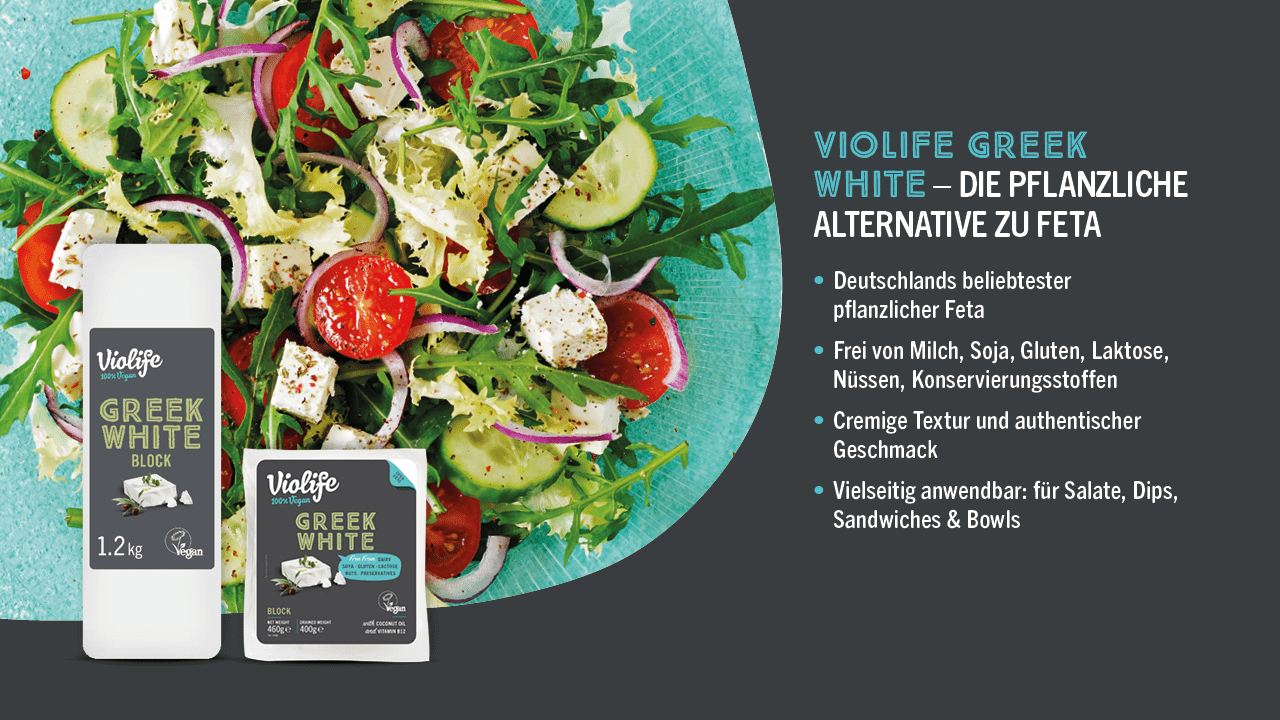 Der Violife Greek White Block ist die vegane Alternative zu traditionellem griechischen Feta-Käse! Eignet sich ideal für die kalte Anwendung - zum Beispiel im klassisch griechischem Salat mit Oliven oder pur mit Kräutern garniert.