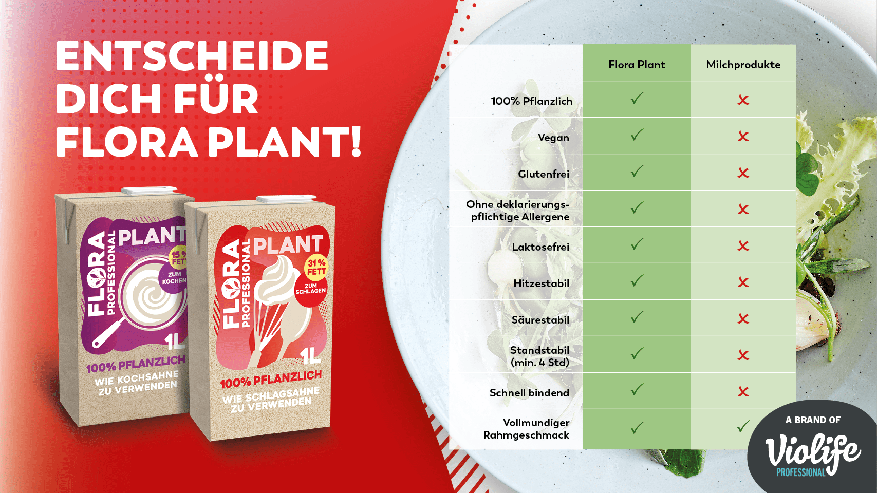 Flora Professional Plant zum Kochen ist 100% pflanzlich, vegan und frei von Allergenen, Gluten oder Laktose.