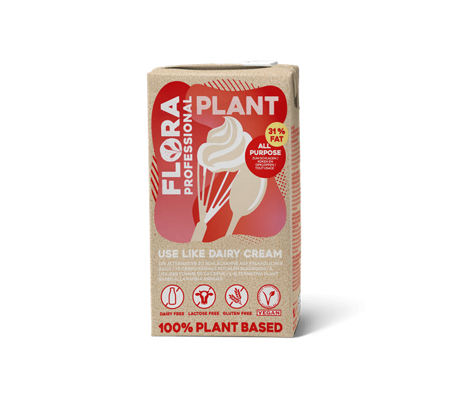 Introducing Flora Professional Plant-Based Cream, a plant-based alternative to dairy cream, made entirely from plants and free from allergens, yet offering the same rich taste and creamy texture as traditional cream. It’s perfect for every menu, whether for mixing beverages, whipping cream, decorating cakes, or making sauces and soups.