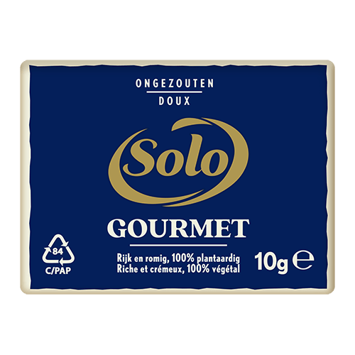 Solo Gourmet s'utilise comme du beurre, pour tartiner, mais en ayant 82% d'impact en moins sur l’environnement que le beurre*. Il est fait d’ingrédients 100% végétaux et 100% naturels.