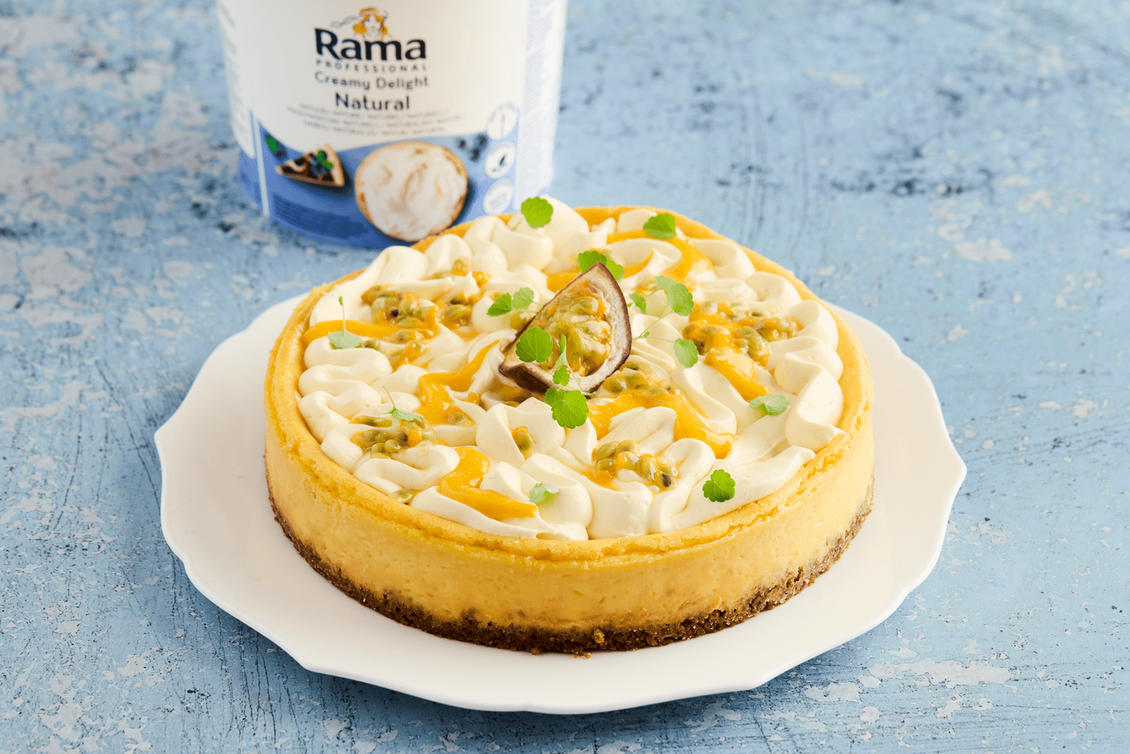 Ce cheesecake cuit à la passion et à la mangue associe la texture riche et onctueuse de Rama Natuur à une curd fraîche et exotique à la passion et à la mangue. Cette recette fruitée est parfaitement adaptée aux cuisines professionnelles, à la pâtisserie et aux applications en carte de desserts. Elle garantit un résultat constant, se prépare facilement à l’avance et convient aussi bien au service à la carte qu’aux desserts ou aux présentations en buffet. Un classique moderne, à la saveur fraîche et fruitée, avec un rendu visuel résolument Instagrammable.