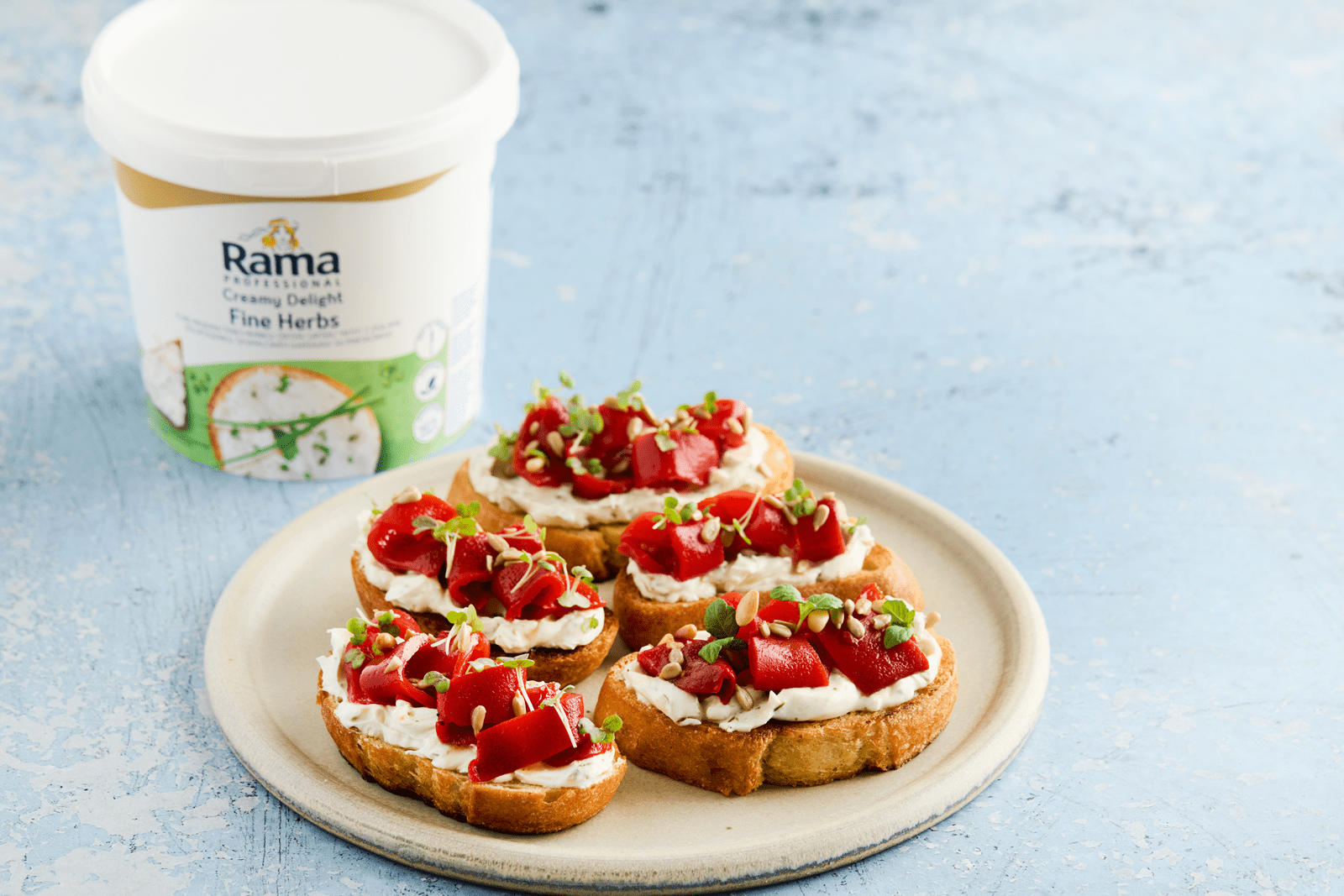 Deze bruschetta met Rama Fijne Kruiden combineert krokant zuurdesembrood met geroosterde rode puntpaprika’s, zaden en verse kruiden. Een snel en smaakvol vegetarisch voorgerecht, hapje of sharing dish, ideaal voor de professionele keuken. Dankzij Rama Fijne Kruiden geniet je van een rijke kruidensmaak en een perfect smeerbaar resultaat.