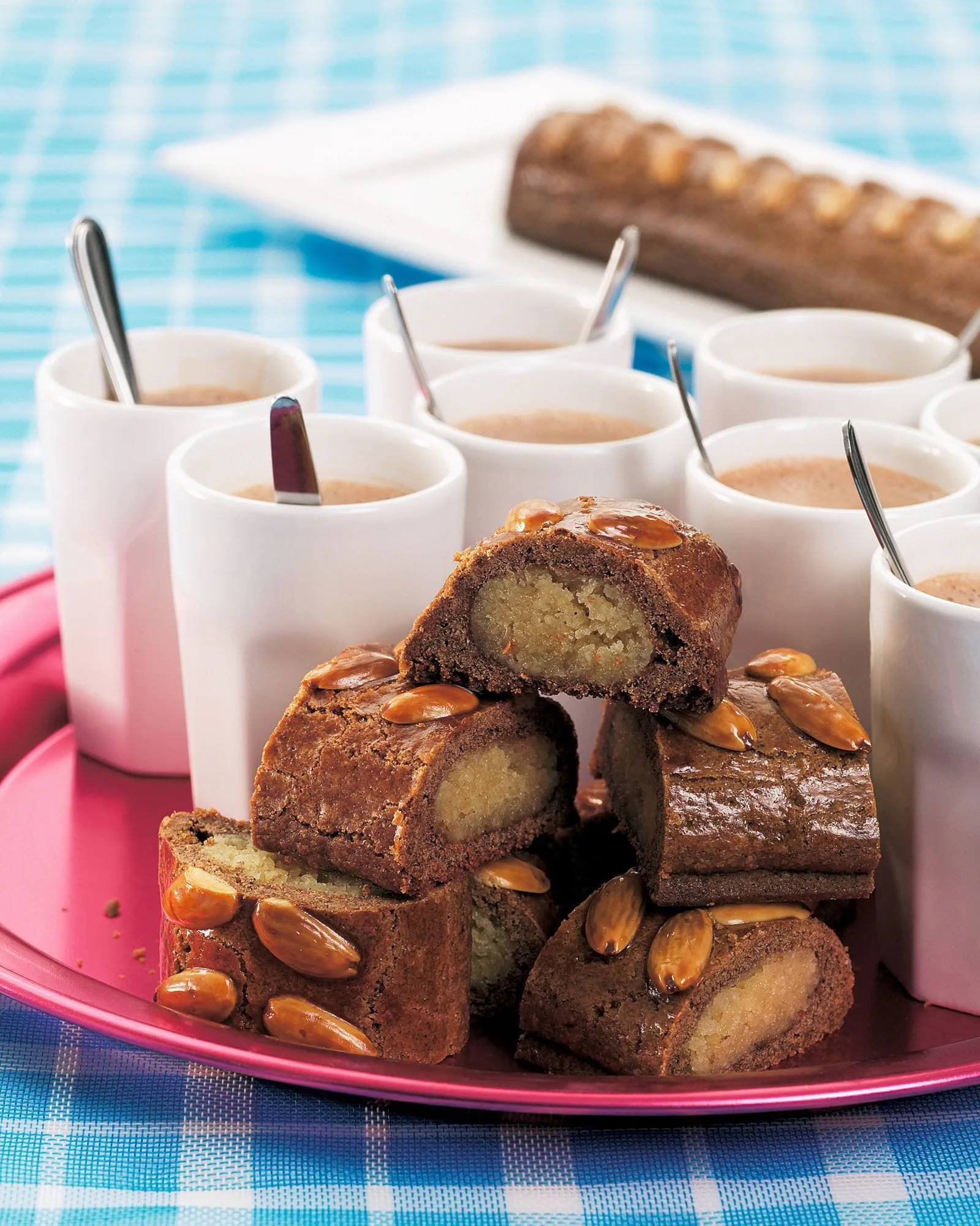Maak intussen de amandelspijs. Maal 500 gram amandelen fijn in de keukenrobot. Voeg de suiker en het ei toe en laat het tot een smeuïge massa draaien. Bestuif het aanrecht met bloem of poedersuiker en rol de spijs uit tot lange rollen.