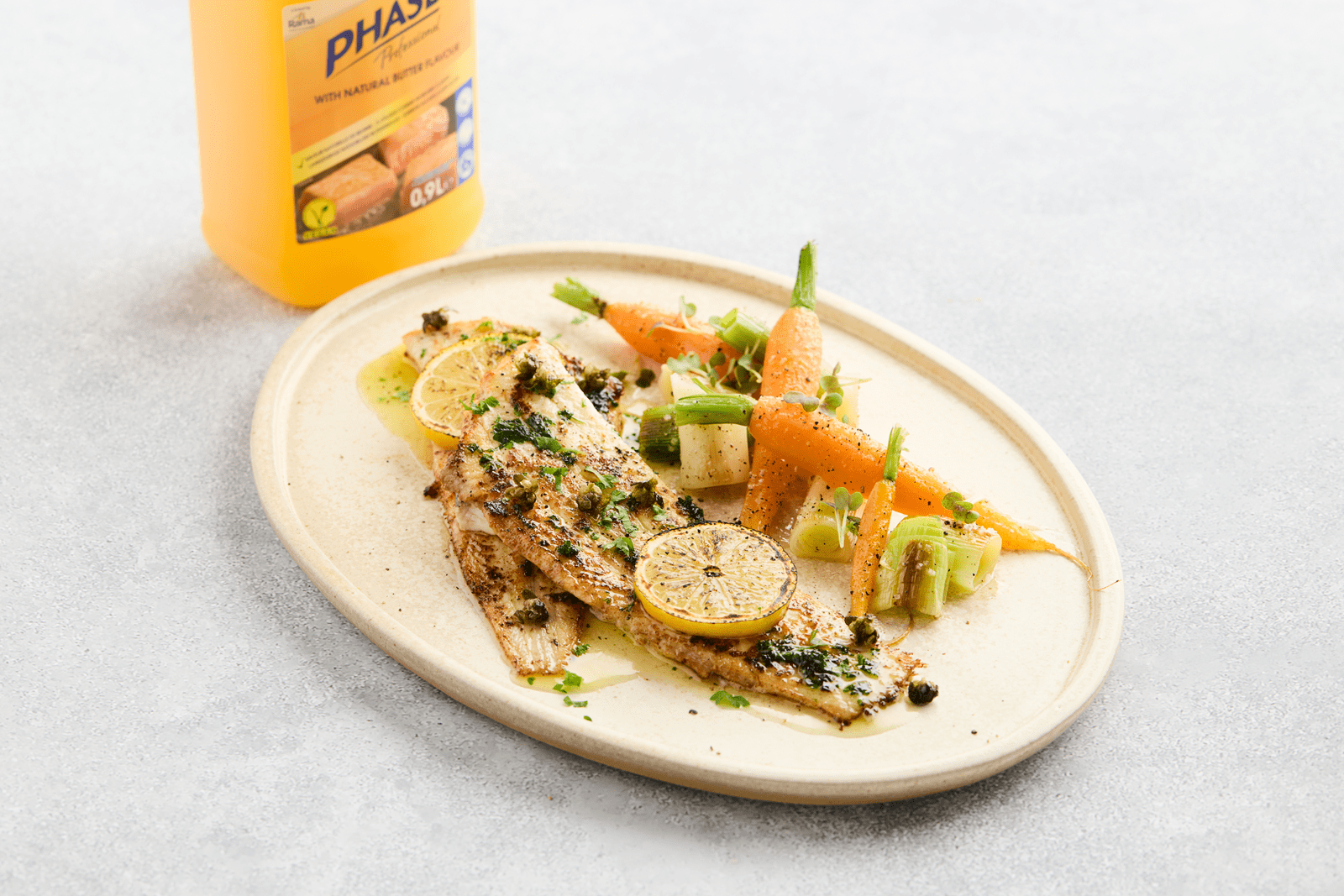 Sol meunière met Phase Butter Flavour is een tijdloze klassieker uit de Franse keuken, perfect voor de professionele horeca. De delicate tong wordt goudbruin gebakken in Phase Butter Flavour en afgewerkt met citroen, peterselie en knapperige kappertjes voor een frisse, volle smaak. Dankzij Phase bereid je een stabiele, aromatische botersaus met constante resultaten en optimale controle in de keuken. Geserveerd met jonge wortelen en prei is dit gerecht ideaal voor restaurants en cateraars die klassiek vakmanschap willen combineren met betrouwbare prestaties en efficiëntie.