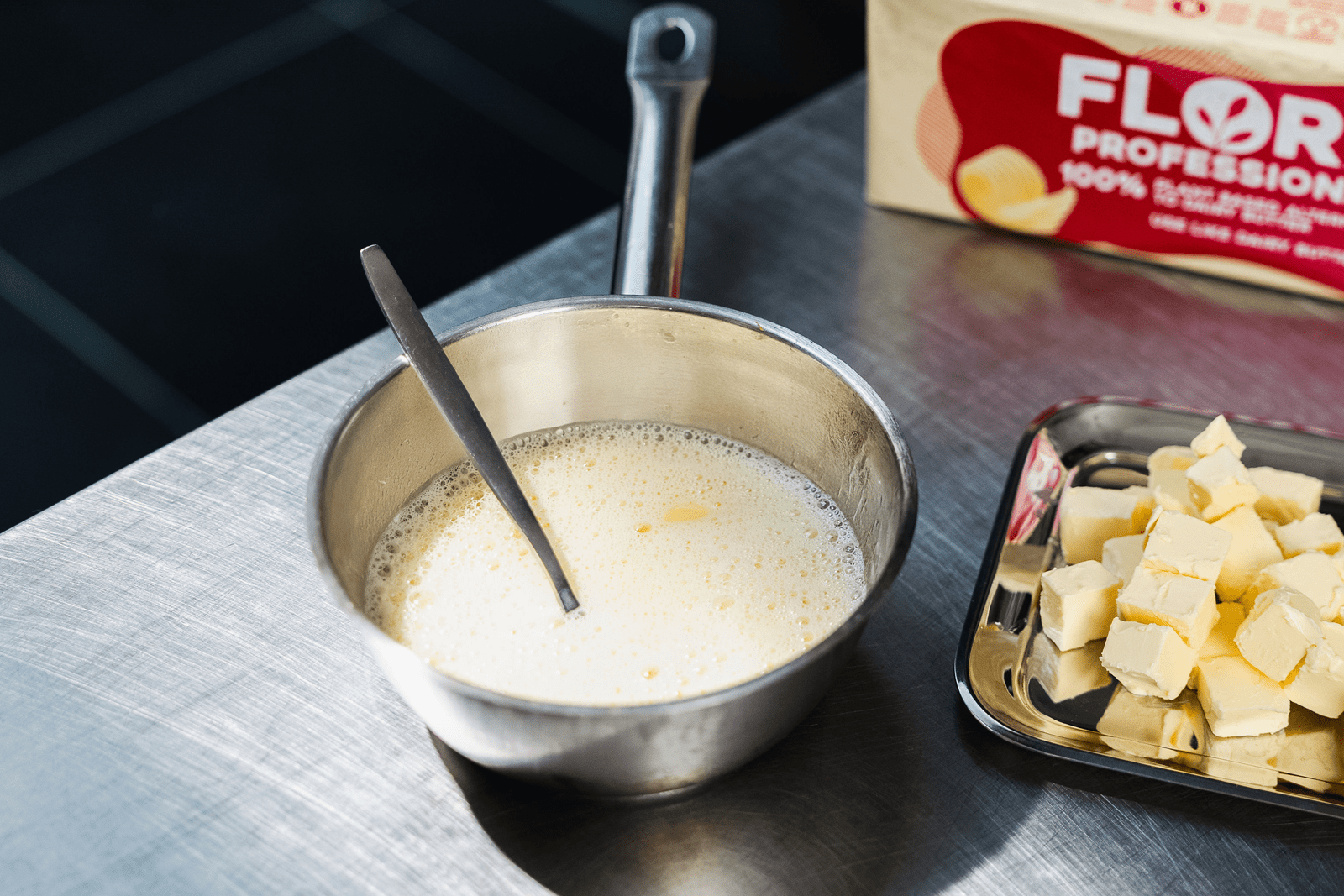 Beurre Blanc is een delicate saus op basis van een zure reductie en gemonteerde boter. Met Flora Professional plantaardig alternatief voor roomboter emulgeert de saus soepel in de castric en blijft hij langer gebonden bij warmhouden. Flora Professional plantaardig alternatief voor roomboter ontmengt minder snel dan traditionele boter, waardoor de saus beter standhoudt tijdens service. Het resultaat is een stabiele, frisse beurre blanc met een gladde textuur en consistente kwaliteit.
