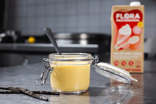 Flora Professional Koken & Opkloppen 31% vet klopt snel op en blijft na het opkloppen langdurig stabiel (tot circa vier uur), met bovendien tot 2.5 keer meer opklopvolume dan reguliere room. Dankzij de stabiele vet- en emulgatorstructuur laat de room zich moeiteloos mengen met afgekoelde banketbakkersroom, zonder in te zakken. Het resultaat is een extra luchtige, gladde en romige crème met meer volume, die zijn mooie structuur behoudt tijdens zowel verwerking als bewaring.